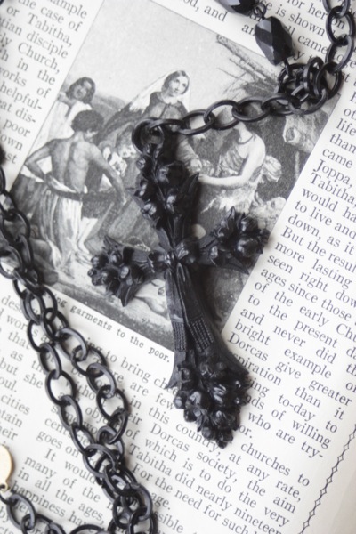 Unbeleivable lovely, this hand cast and lushly carved 3" cross hangs from a a 28" brass-tone chain (with a 1" extender), the chain is further adorned by a dozen faceted glass beads, this piece is designed and created by artist Caramia Visick in San Francisco, CA (shown with other items available separately) WAS $104 NOW on SALE