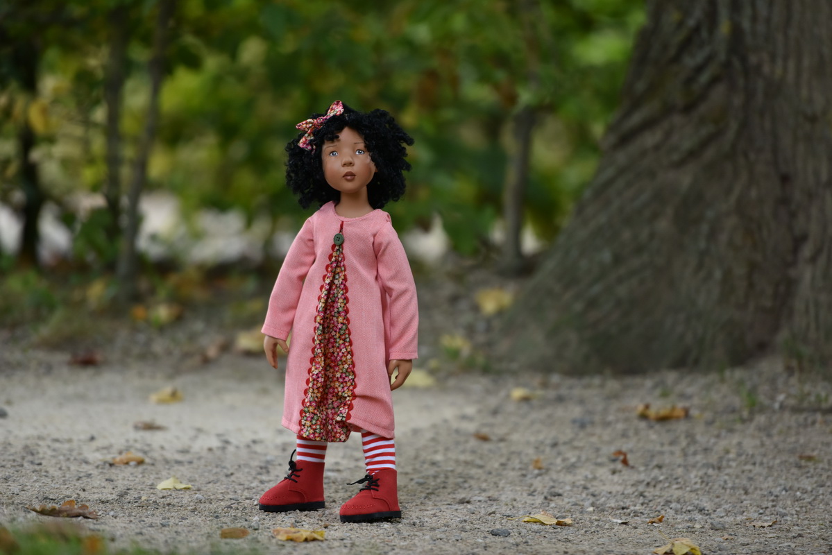 ...a wonderful NEW girl from the 2022 Junior collection of talented artist Nicole Marschollek-Menzner of Zwergnase Dolls, she stands 35cm or 14". She has a vinyl body in the new color called "cappuchino" and her lush wig is Kanekalonwig -- the best quality synthetic fibers from Japan. Her face is lovingly hand-painted. She wears a really darling outfit with real leather shoes and well tailored details. Made in Germany....signed hang tag and emblem branded canvas toggle bag come with her....she is in stock and ready to ship NOTE HER BUTTON IS NOT A CLOWN as shown in the stock photos but a darling acorn as shown in the photos on the white backdrop -- she will be ordered for you so there will be a delay in shipping