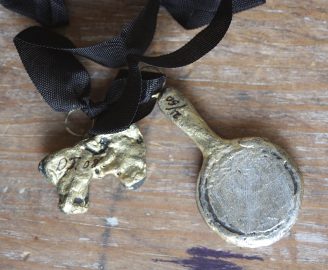 this is the third in a series of exclusive charms Debbee has designed for Earth Angels -- a wee bow and mirror -- so dear Only 50 sets were made and VERY FEW REMAIN available...the wee mirror and bow inspire beauty, charms are 2" and 1" and hang from a vintage ribbon, the set was originally $98, NOW on SALE -- can be worn or used as ornaments