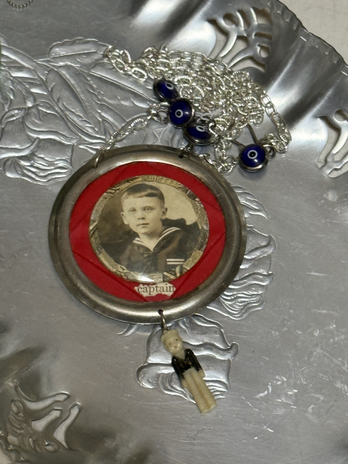 Wearable altered art pendant created with a melange of found and vintage objects, ephemera, antique findings -- including Bakelite and wonderful celluloid mini sailor -- approx 3.5." pendant hangs from an 24" chain, overall length measures approx. 25” created by artist Dara DiMagno, singular in style and story, her work has been featured by Country Living, Romantic Homes and Where Women Create Magazines, WAS $165, NOW featured as a SALE item…