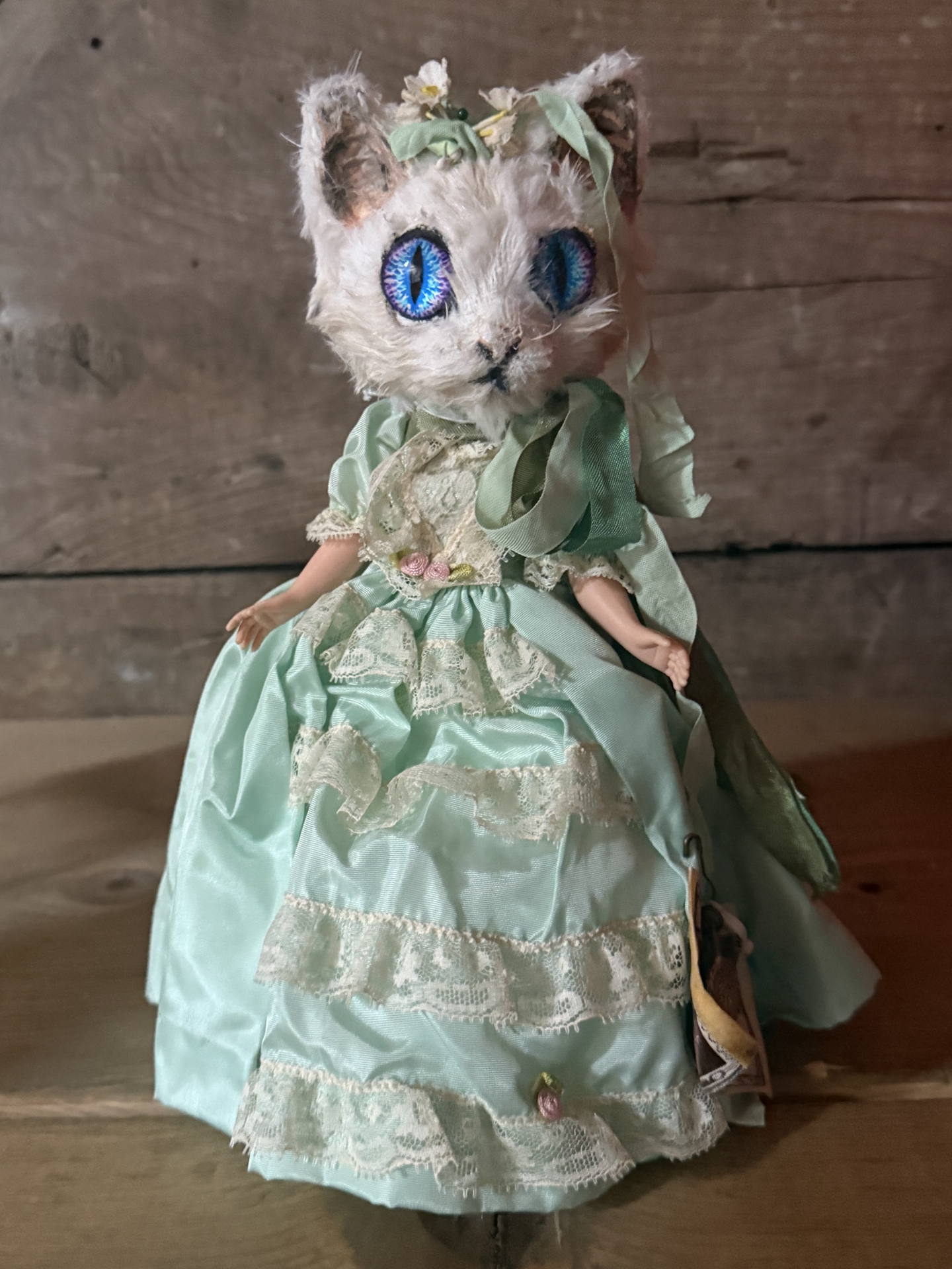 created with antique and found doll parts and textiles, with remnant object and vintage ribbon embellishments, glass eyes and more (shown with a friend, available separately)