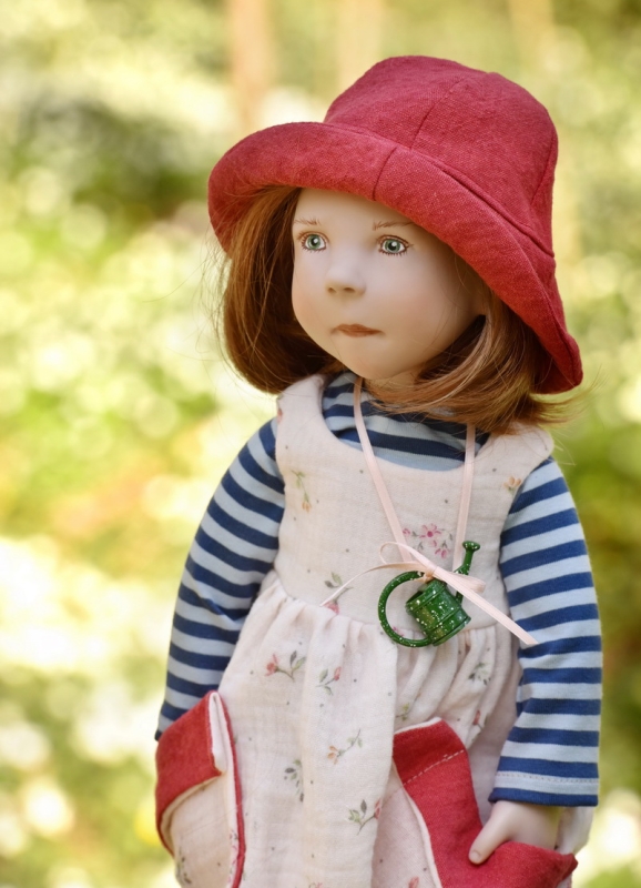 Wonderfully darling JULICA is a sweet girl and part of Volume II of the 2024 Collection from Zwergnase Puppen and the studios of artist – Nicole Marschollek-Menzner. She stands 50cm/19.5” and has a full vinyl body of phthalate-free material with 5 joints for posing and mobility. Her vinyl color is “CAPPUCHINO”. She has a hand-painted face, she has a kanekalon wig, real leather shoes, and a darling outfit of lovely materials including her hat . She is made in Germany. She comes in an emblem branded cotton drawstring bag. She will be delayed in shipping as she will be ordered from you